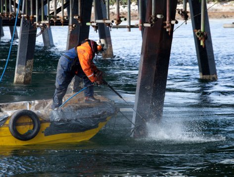 One of the major challenges on the project was to come up with an access system that was quick to install and could be hung from the existing structure. This aspect of the work was satisfied using a combination of traditional hanging scaffold and a decking system suspended from tensioned cables called WebDeck. Both of these systems had to be carefully positioned to ensure the underside of the platform was above the level of the highest tide.