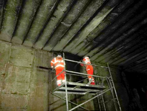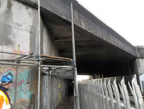 CRL carried out ECI works initially with Skansks to develop the logistics for access, welfare and storage as the works needed to be undertaken under possession at night and access was only available via the M4 near the Swindon junction 16. A temporary support structure was erected that provided a platform to place the welfare, storage and plant, so that these facilities would be in place at the start of each shift. One side was scaffolded with a protection screen. A scaffold staircase provided access from the road down the embankment to the bridge by the rail lines and tower access was used to access one side and the soffit repairs. This tower had to be erected and dismantled for each shift/possesion.
