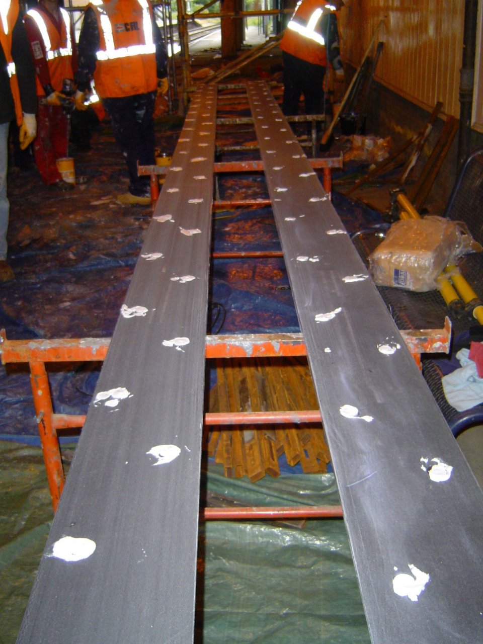 The beams were prepared by vacuum blasting and the application of a Sika primer paint. The CFRP plates were bonded to the cast iron beams using Sikadur 31 adhesive applied to the beams and plates. CRL designed a special temporary clamp system to hold the plates in position whilst the adhesive cured. These were removed one week after installation.