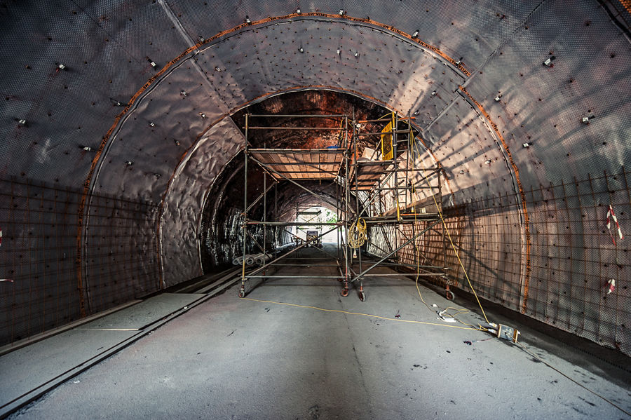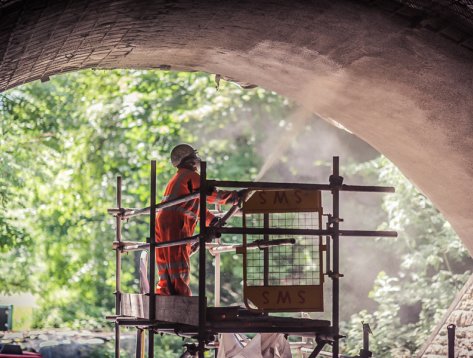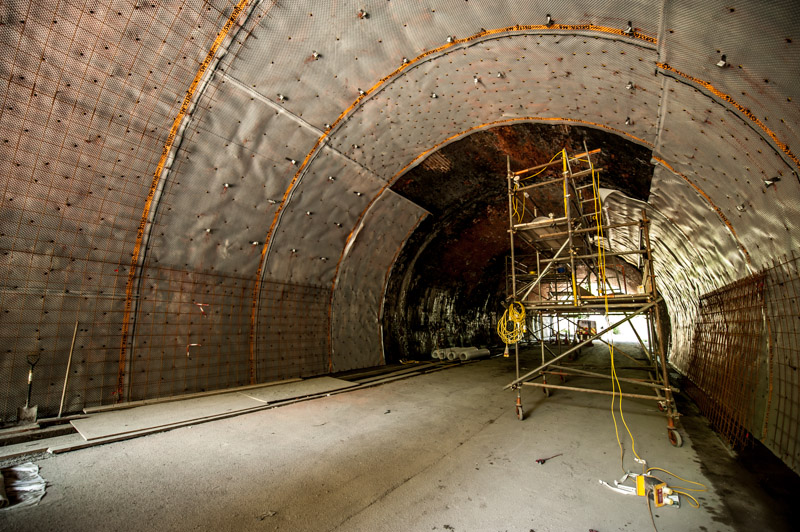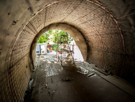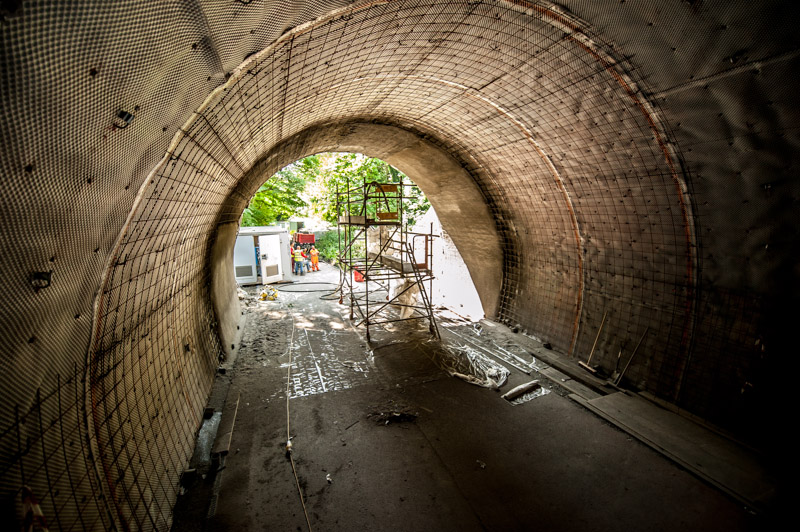 The works were carried out from May to July 2013. The scope of works included preparation of the tunnels existing brick surface using high pressure water jetting and the application of a new Delta drainage membrane; comprising the Delta 500 membrane secured to the brick surface using delta quick seal plug fixings and dressed into the stone quoins at either end of the tunnel. The membrane was then covered by a sprayed concrete lining reinforced with a steel mesh, fixed with steel dowels to the original brick structure.
